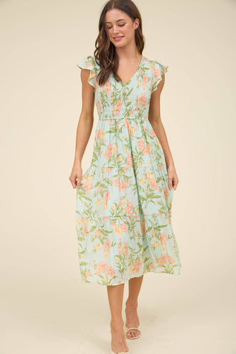 FLORAL V NECK SMOCKED TIERED MIDI DRESS